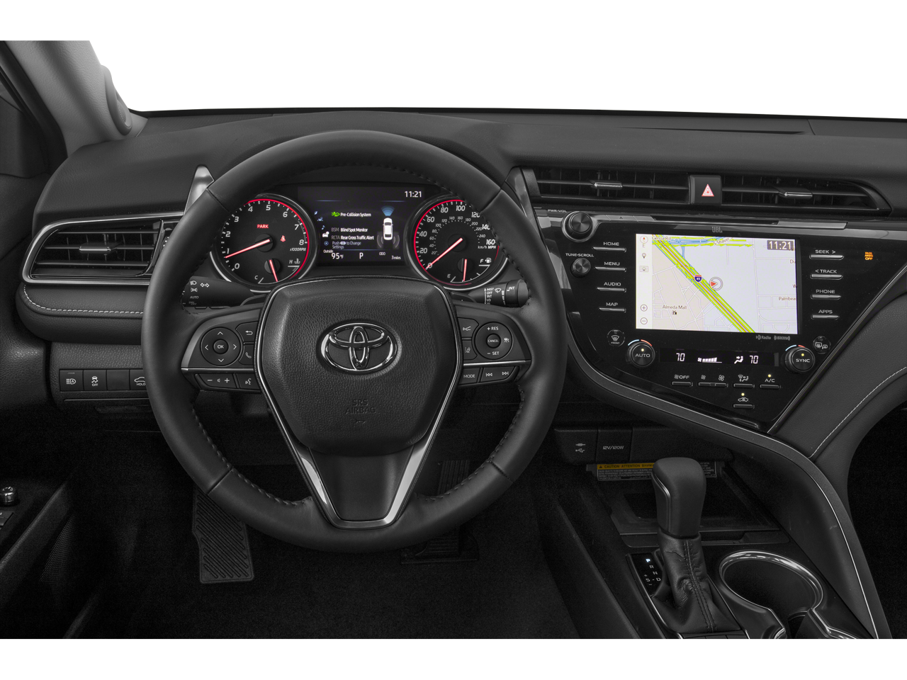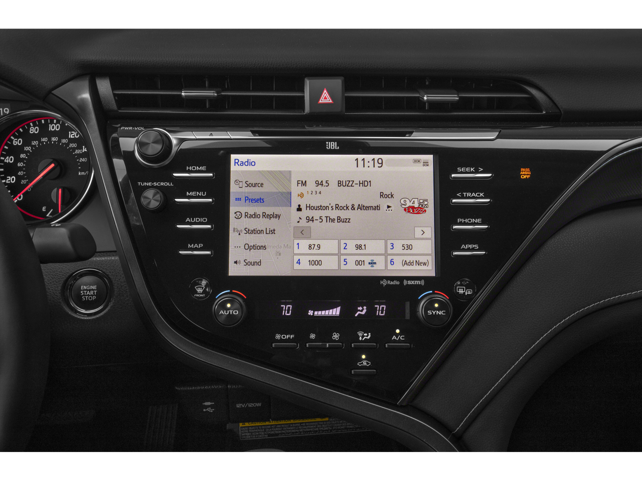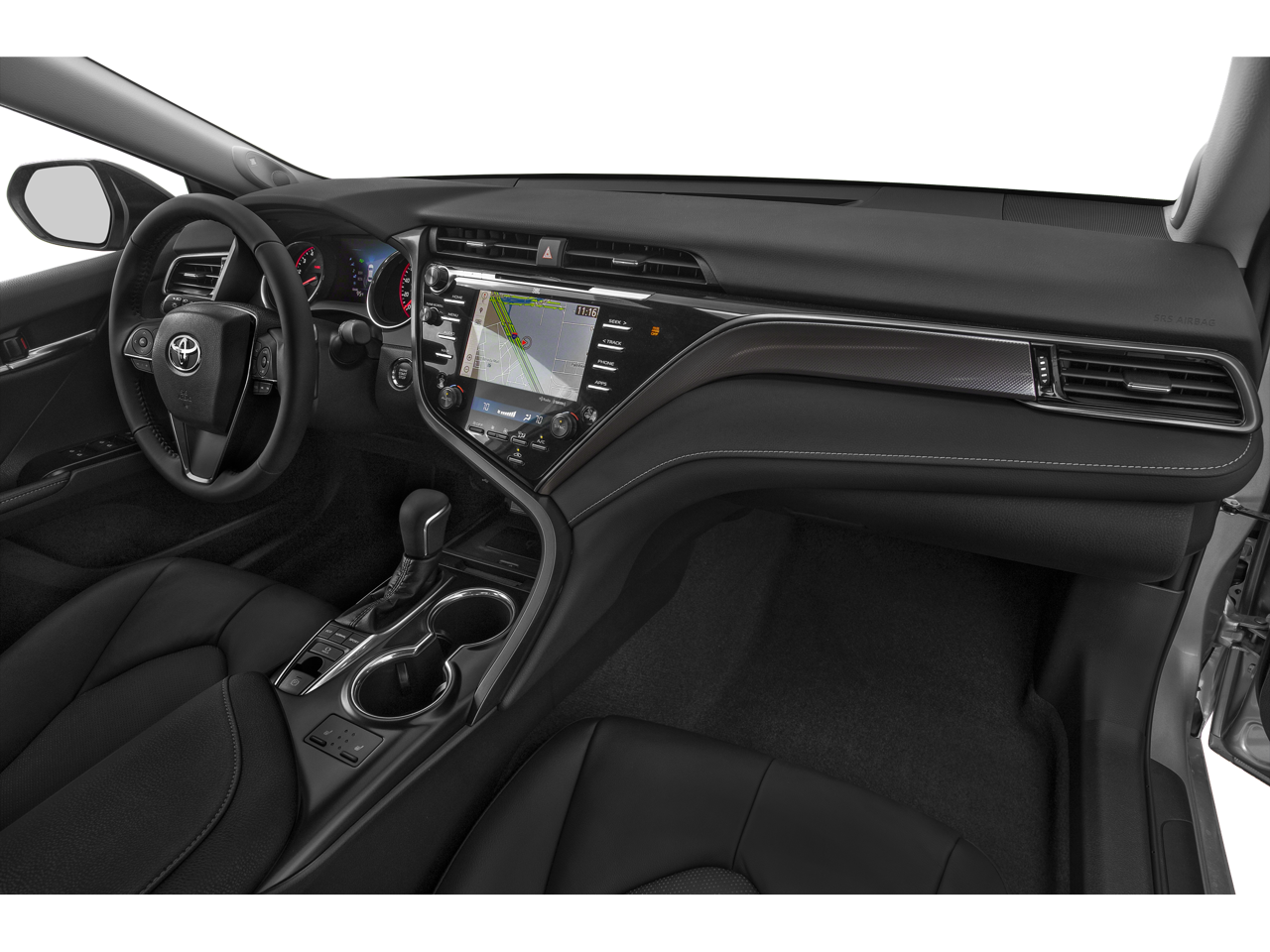Stepping inside, you'll be greeted by premium features that elevate the Camry's already impressive cabin. The multi-stage heated front bucket seats wrapped in perforated leather provide unmatched comfort, while the sport steering wheel and tachometer add a touch of sportiness to the refined interior. The Entune 3.0 audio system with 6 speakers and steering wheel-mounted controls ensures your music is always within reach.